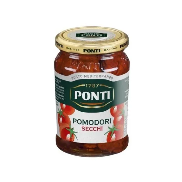 Los Pomodori Secchi 280g de Ponti son tomates italianos seleccionados y secados al sol, conservados en aceite de oliva y aromatizados con especias mediterráneas. Gracias al cuidadoso proceso de elaboración de Ponti, una marca con más de 230 años de historia, obtienes un producto de sabor equilibrado, textura firme y carácter intensamente italiano.