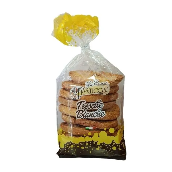 Las Friselle son un pan tostado tradicional de la región de Apulia, en Italia, conocido por su textura crujiente y versatilidad en la cocina. Estas rosquillas de pan duro se humedecen ligeramente antes de servirse y son la base perfecta para acompañamientos como tomates frescos, aceite de oliva, hierbas y otros ingredientes mediterráneos. Ideales para aperitivos, ensaladas o como snack saludable, las Friselle aportan un toque auténtico de la cocina italiana. Disfruta de su sabor rústico y su textura única, que las convierte en un básico de la gastronomía italiana.