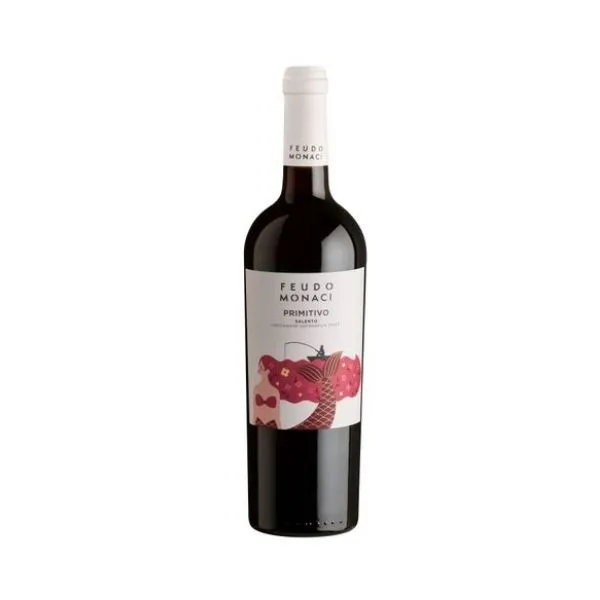 El Feudo Monaci Primitivo Salento IGT, producido en Salento por Castello Monaci, es un tinto vibrante elaborado al 100 % con uva Primitivo cultivada en suelos arcillosos con toba caliza, a unos 30 m sobre el nivel del mar. Las uvas se cosechan a mano y fermentan en tanques a temperatura controlada con 10 días de maceración, seguidas de fermentación maloláctica y crianza en acero hasta junio siguiente.