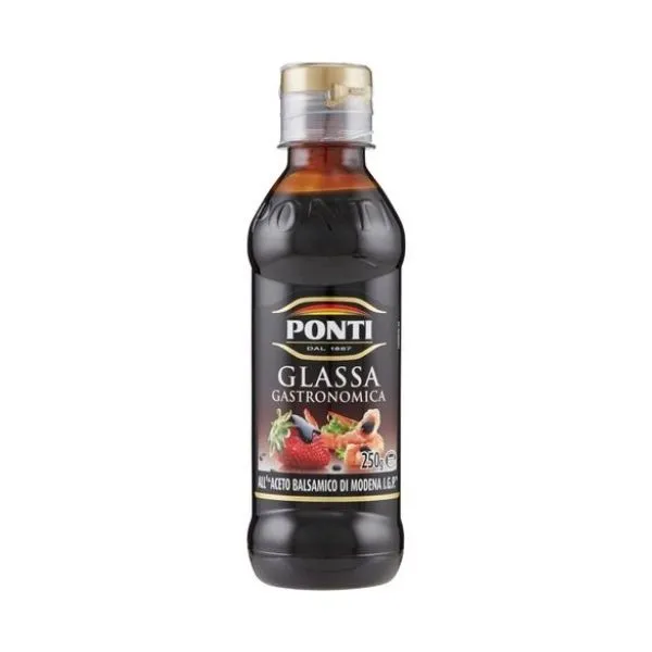 La Glassa Gastronómica Ponti es una reducción concentrada de vinagre balsámico ideal para realzar el sabor y la presentación de ensaladas, carnes, verduras y postres. Su textura densa y brillante aporta un toque elegante y un sabor agridulce característico del vinagre balsámico italiano tradicional.