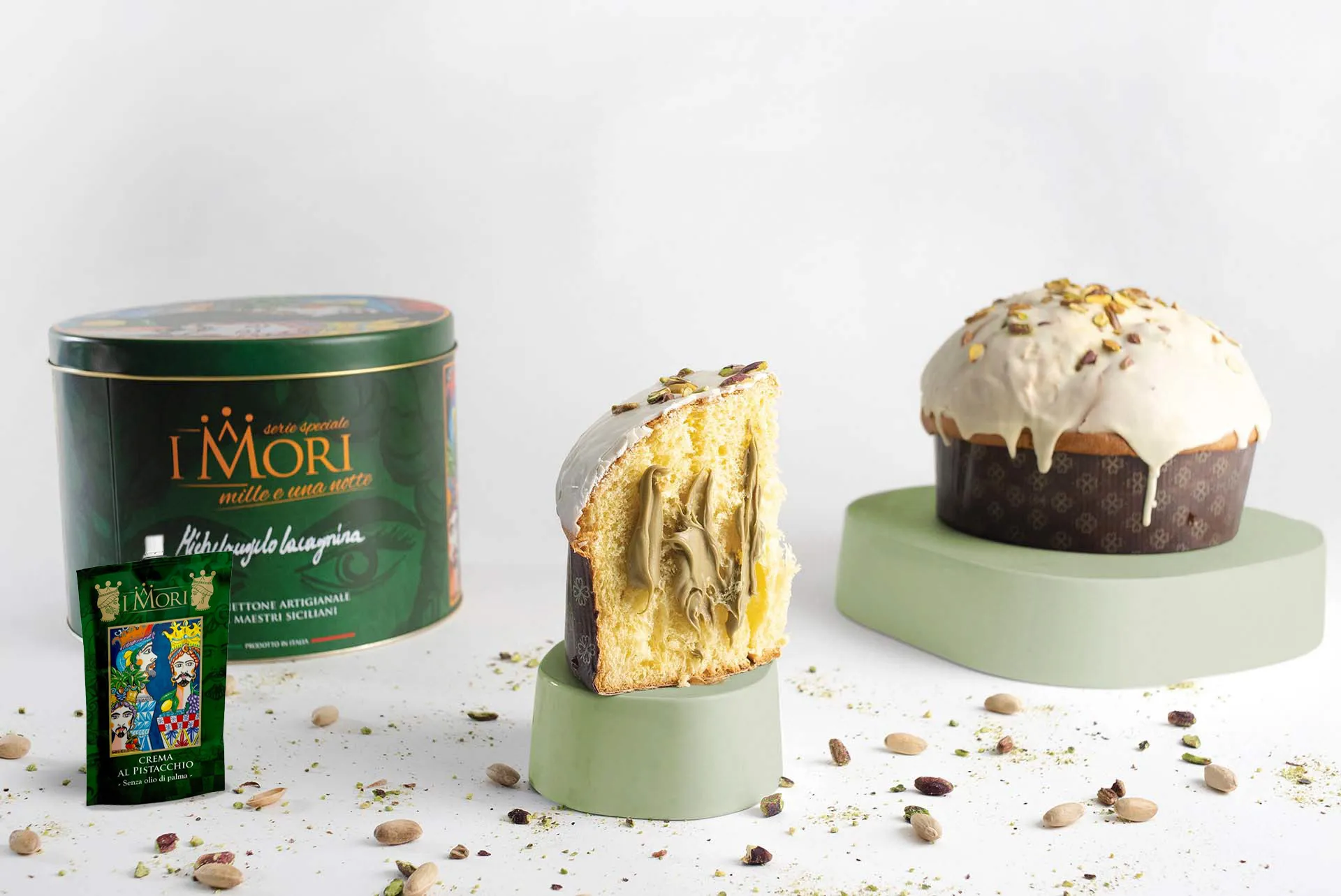El Panettone al Pistacchio Siciliano I Mori es una especialidad italiana que combina la suavidad del pan artesanal con el sabor único de los pistachos sicilianos.